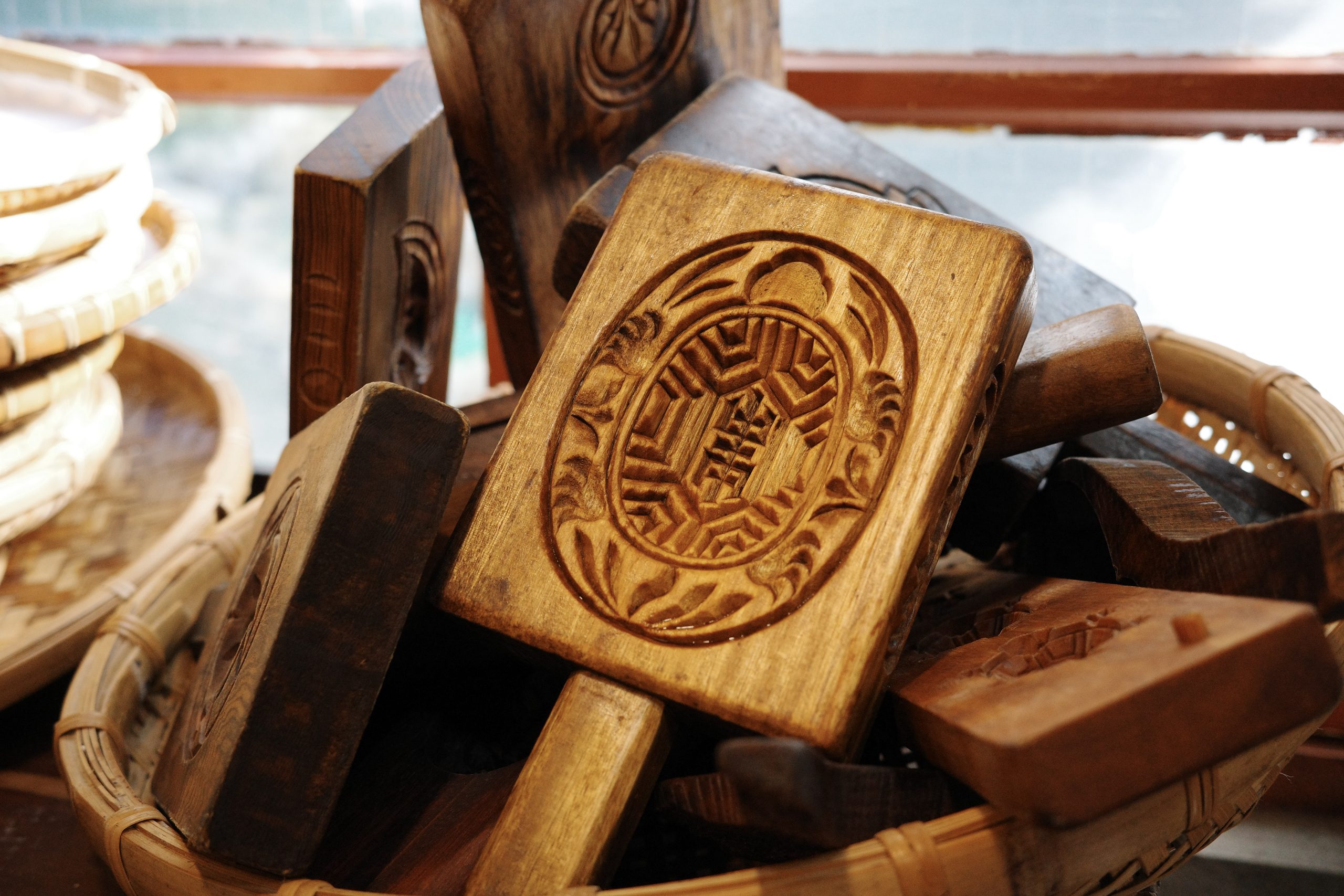 在分享的當下,周老師拿出一個有著四面雕刻(烏龜)(桃子)(錢)(鯉魚)的模板,不同的圖像寄寓著長壽、多子多孫、賺錢等祈願,這些模板都是阿嬤留下來的,其中一個更是在阿嬤的阿嬤71歲做壽時特別雕刻,用這個模具做出來的粿分送給親朋好友,是感謝、祈福也是祝福。